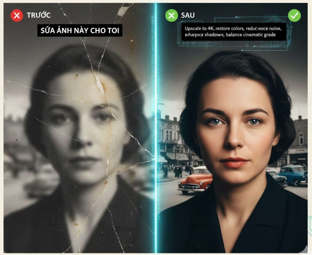 • ✅ Câu lệnh chuẩn: “Hãy tái tạo phiên bản hoàn chỉnh: Tăng nét tổng thể – Phục hồi màu – Xóa khuyết điểm – Làm sáng chi tiết và giải thích chi tiết từng thay đổi.”
